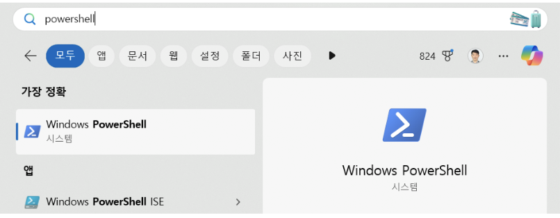 윈도우 검색 > 파워쉘(Powershell)을 입력하여 실행한다.
