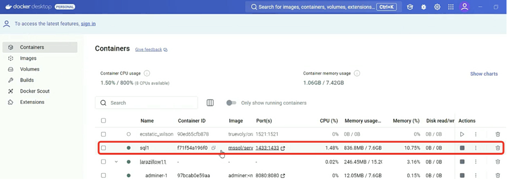 도커 데스크탑에서 MS SQL이 잘 실행되고 있는 지 확인한다. 실행되고 있지 않다면, 삼각형 실행버튼을 눌러 실행시킨다.