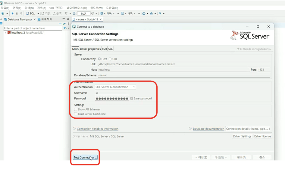 환경설정 창이 뜨면 Username 에 sa를 입력하고, Password에 앞서 설정한 패스워드를 입력한다.(아래 docker run 창 참조) 테스트 커넥션(Test Connection)을 선택하여 연결에 이슈가 없는지 확인한다. 문제가 없으면 connected라는 메세지가 뜬다.