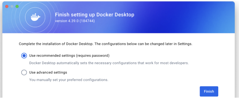 다운로드 받은 도커데스크탑 파일을 설치 후 환경설정을 하자. 서비스 규약에 동의한다.