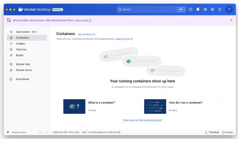 도커 데스크탑에 로그인 하면 다음과 같은 화면이 실행된다.