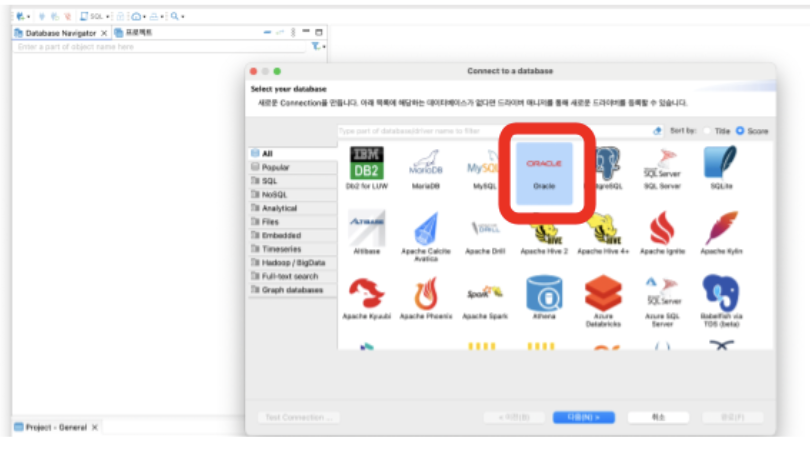 맥용 DBeaver를 다운로드하여 설치한 후, 오라클에 연결해보자. DBeaver는 dbeaver.io 에서 다운로드 받아 설치할 수 있다. 설치한 후 데이터베이스 > 새 데이터베이스 연결 메뉴에서 Oracle을 선택하고 다음을 클릭한다.
