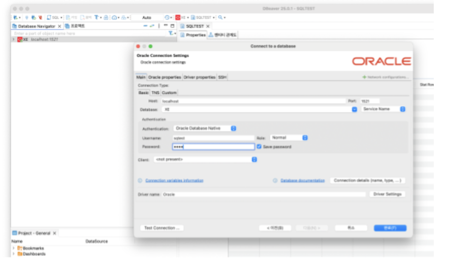 Host는 localhost 로 입력하고, Database는 XE를 입력하자. Username과 Password는 앞서 생성한 계정과 패스워드를 입력하면 된다.