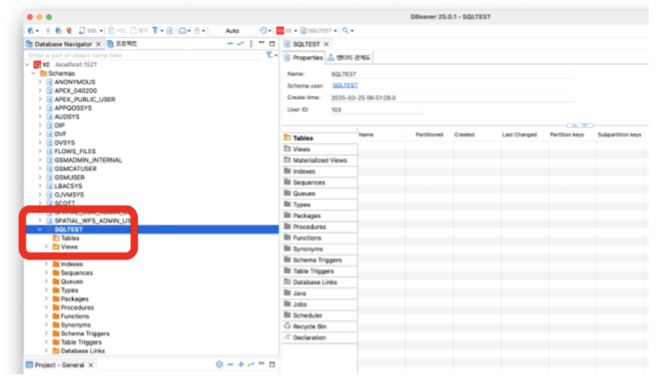 접속 후에는 sqltest 스키마를 찾아서 클릭해보자. 선택은 되지만 생성한 테이블이 없으므로 객체 목록은 보이지 않는다.