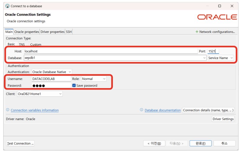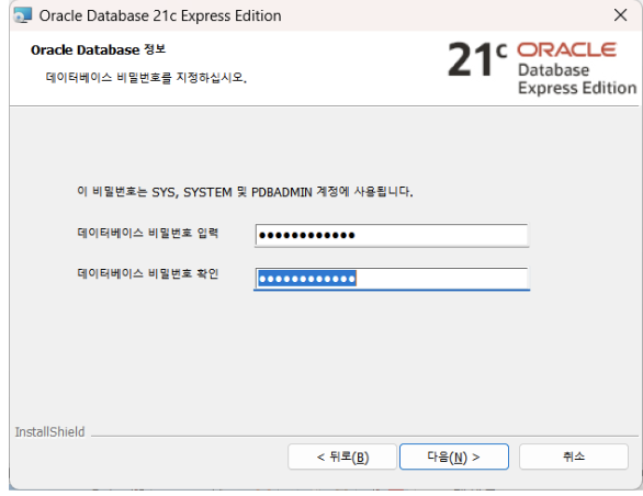 오라클 관리자 계정(SYSTEM)의 비밀번호를 입력한 후 다음을 클릭한다.