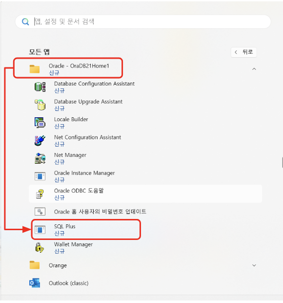 SQL Plus로 사용자 계정을 생성하자. SQL Plus를 실행하기 위해서는 위 (11)번 처럼 윈도우 메뉴를 선택해서 이동해도 되지만, 윈도우 커맨트 창에서 sqlplus 를 직접 타이핑하여 접속할 수도 있다.