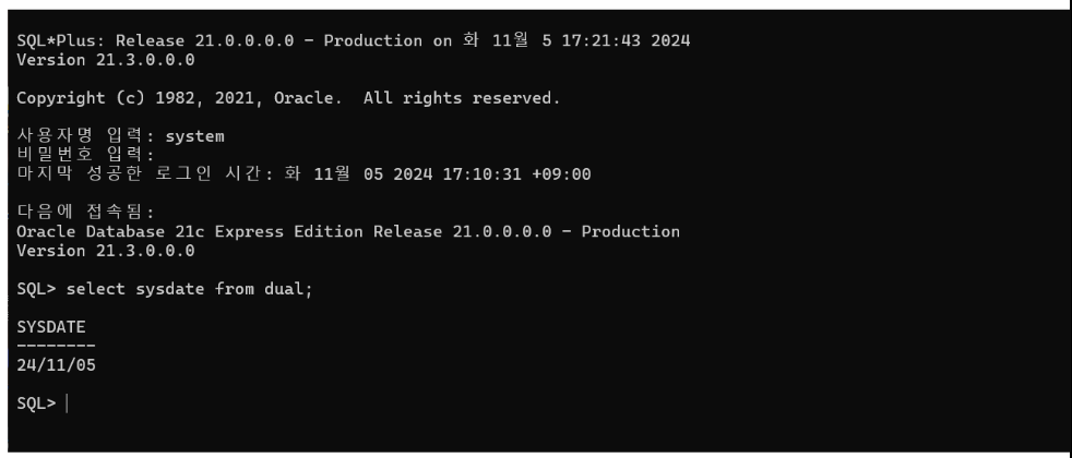 SQL Plus에 접속한 후 아래의 명령어를 입력해보자. 오늘 날짜가 출력이 되면 사용자 계정을 잘 생성한 것이다.