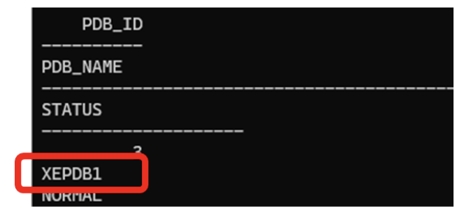 현재 존재하는 PDB를 확인한다. Oracle 12 버전 이후, 데이터베이스가 CDB(Container DB)와 PDB로 구분되었다. PDB는 Pluggable DB의 약어로 일반 사용자는 PDB에 생성하는 것이 좋다. 아래 명령어를 SQL Plus에 입력한다.