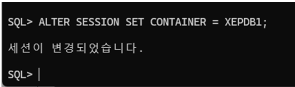 확인한 이름의 PDB에 데이터베이스 사용자를 생성하기 위해서 먼저 PDB로 연결을 전환한다. 아래 XEPDB1 이 확인한 PDB의 이름이다. 아래 명령을 실행하면 입력한 이름의 PDB로 세션이 변경된다.
