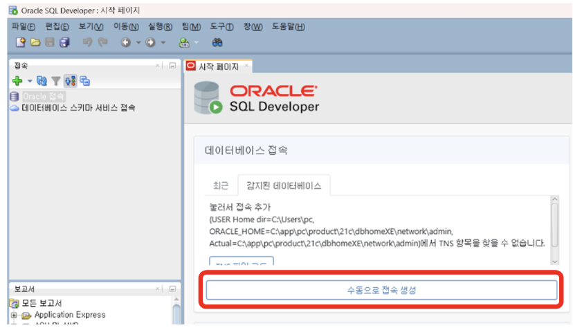 SQL Developer 를 실행한 후 데이터베이스 접속 설정을 해주어야 한다. 수동으로 접속 생성을 클릭한다.