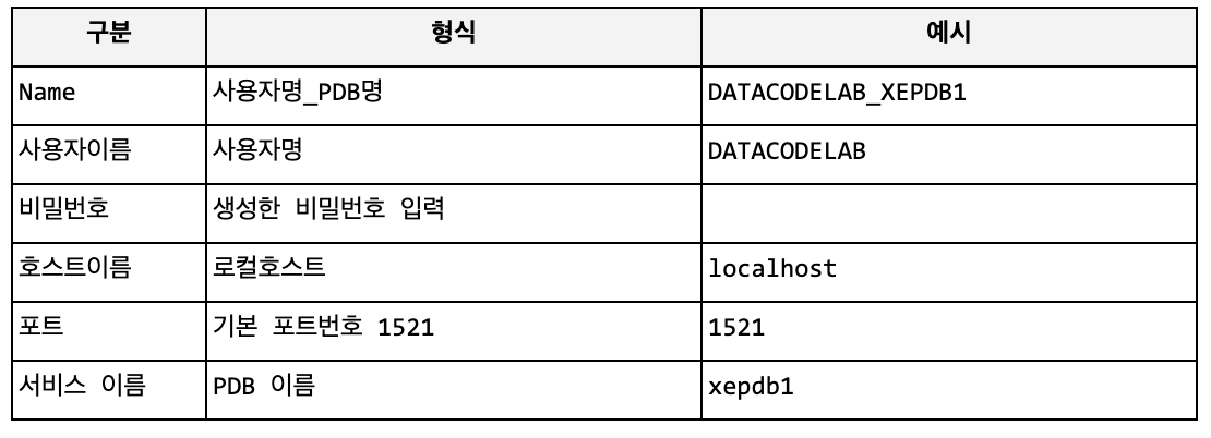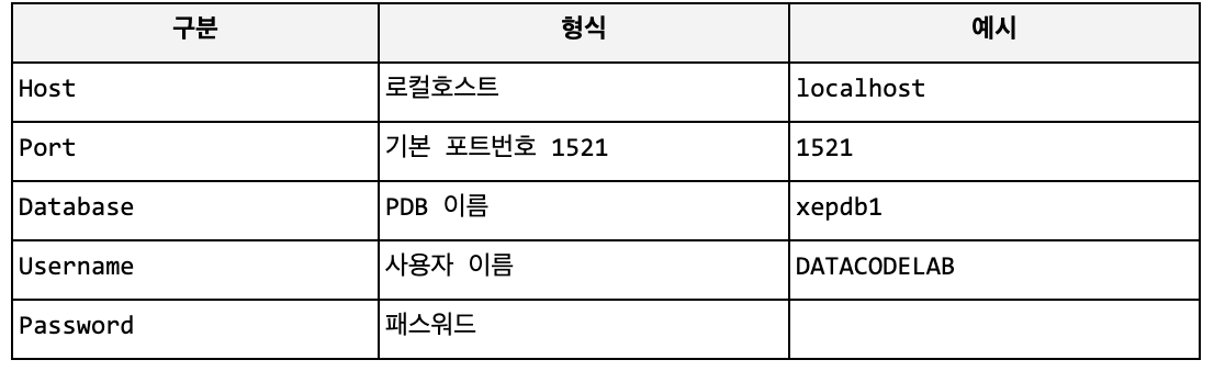 sqlplus DATACODELAB/1234@//localhost:1521/xepdb1아래와 같이 단계별로 입력해도 된다.