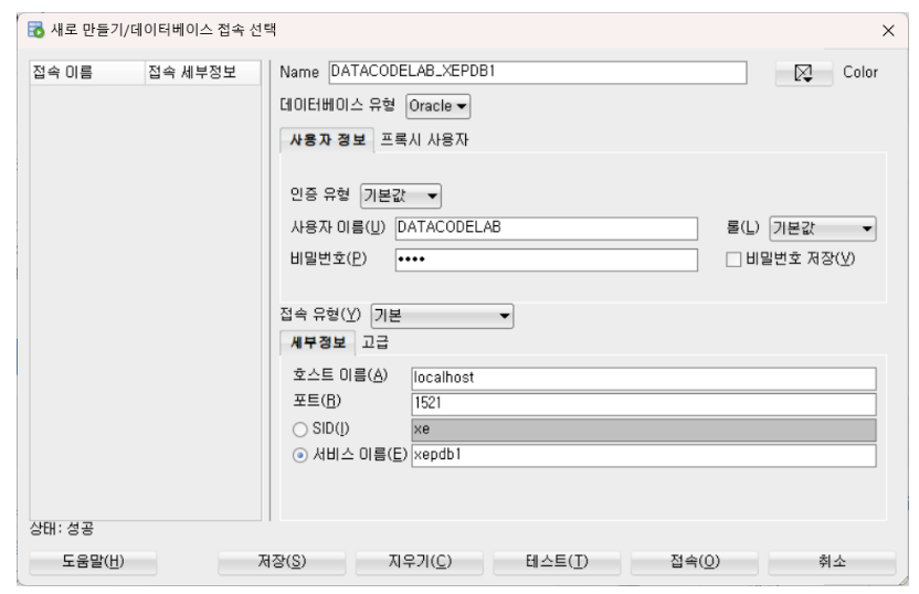 SQL> GRANT DBA TO DATACODELAB;정상 실행되면 ‘권한이 부여되었습니다’라는 메세지가 뜬다.
