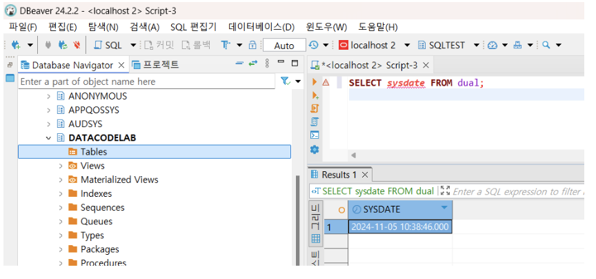 완료 버튼을 클릭하면 DBeaver 창이 뜬다. 질의 작성기에 SELECT SYSDATE FROM DUAL;을 입력하고 실행 버튼을 클릭해보자. 결과가 나오면 정상 연결된 것 이다.